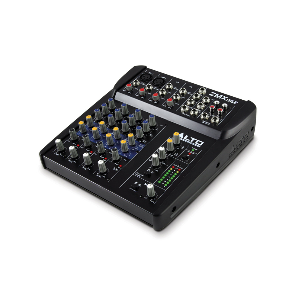 El ZEPHYR ZMX862 es un mezclador de 6 canales y dos buses que dispone de suficientes entradas, salidas, direccionamiento y EQ para afrontar pequeñas sonorizaciones. Dispone de dos entradas microfónicas con alimentación phantom y jacks TRS balanceados, EQ de tres bandas y dos envíos auxiliares en cada uno de los dos canales mono y los dos canales estéreo. También incorpora entradas de dos pistas.
